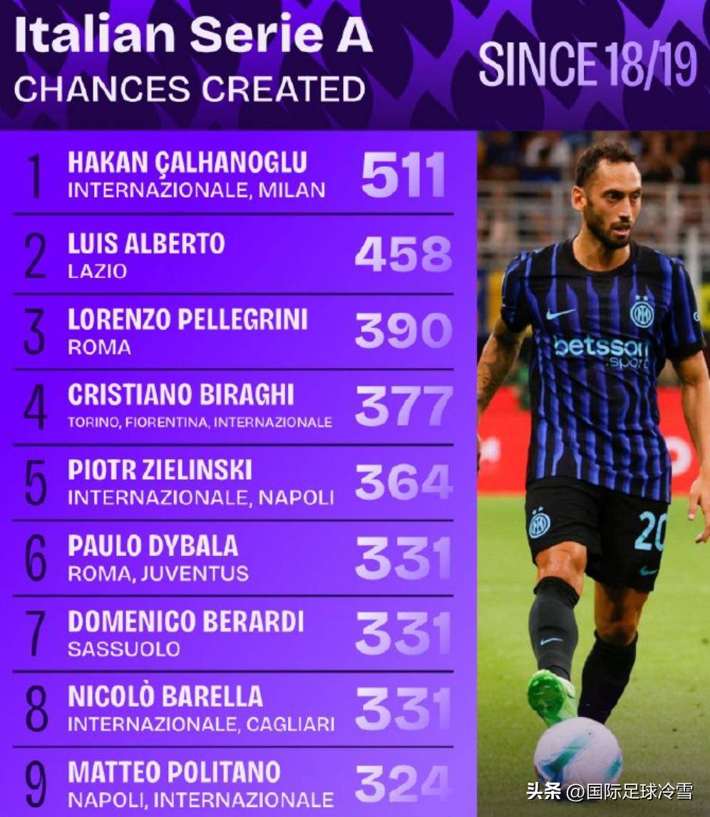 事实上,泽林斯基在国家队的出色表现并非偶然。数据统计显示,自2018-19赛季以来,在意甲赛场上,恰尔汗奥卢以511次关键传球高居榜首,是创造机会能力最强的球员。紧随其后的是阿尔贝托(458次)、佩莱格里尼(390次)、比拉吉(377次)和泽林斯基(364次)。